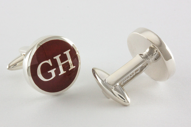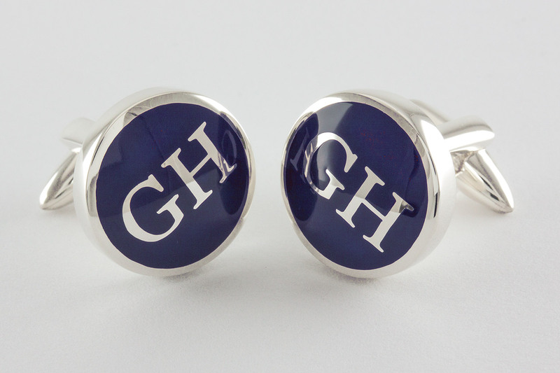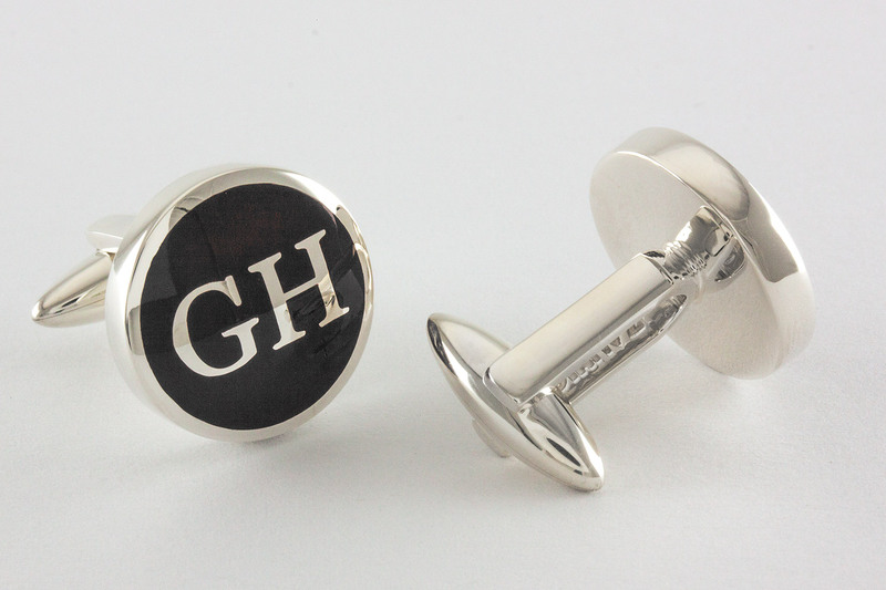 Accentuate your wardrobe with these sterling silver cufflinks, featuring a striking black enamel contrast and prominent serif initials. These tailored accessories are perfect for adding a personal touch to your formal wear, offering both style and elegance.
