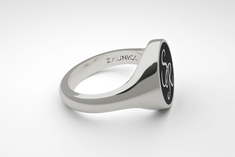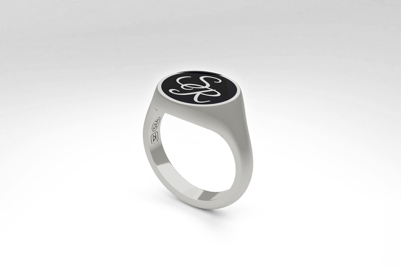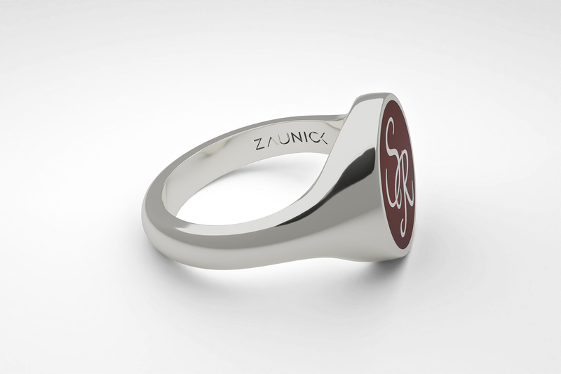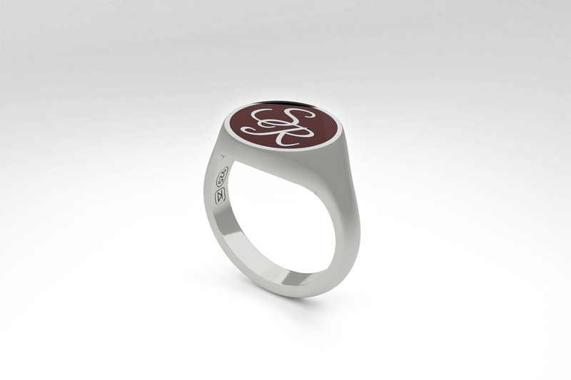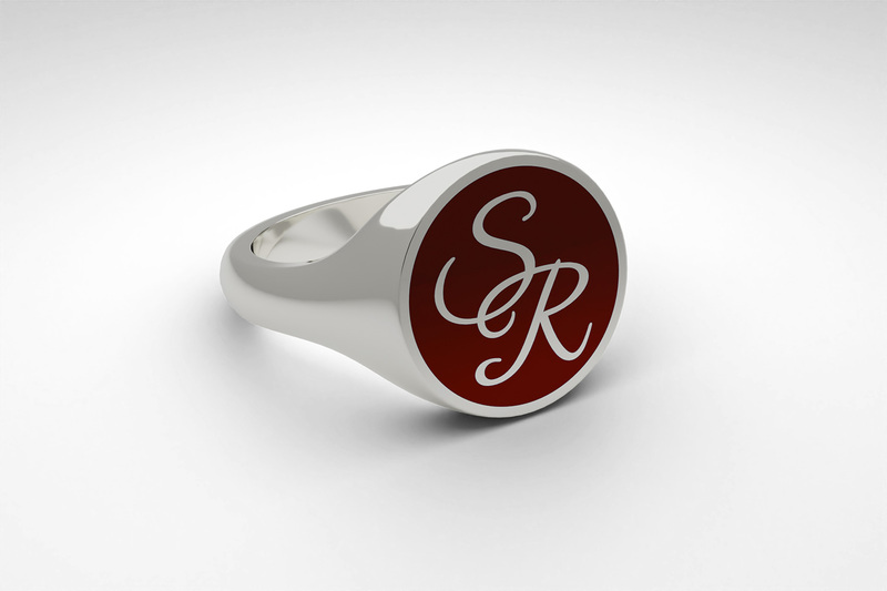 Round signet ring with your monogram in a calligraphy font. Handcrafted in silver 925. The ring is available in burgundy red, navy blue and black ceramic enamel.